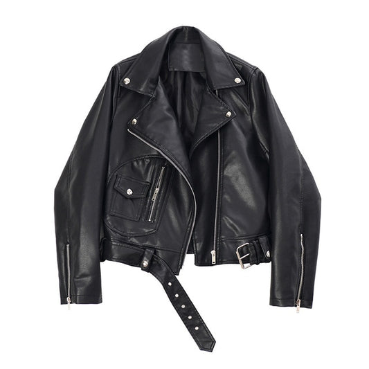 FTLZZ New Autumn Women Pu Leather Jacket Woman Zipper Belt Short Coat Female Black Punk Bomber Faux Leather Outwear